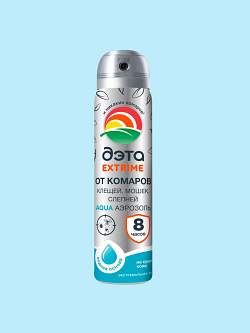 Аэрозоль от комаров, клещей, мошек и слепней Дэта Аква. Обеспечивает надежную защиту от мошек, клещей, комаров, мокрецов, слепней и москитов до 6 часов. Удобная аэрозольная упаковка позволяет легко наносить средство на кожу и на одежду.