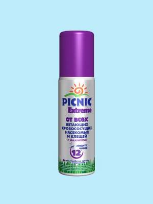 Аэрозоль Picnic Extreme с эвкалиптом от всех видов летающих насекомых и клещей. Действующее вещество: высокоэффективная ДЭТА, усиленная синергистом. Средство содержит натуральное масло эвкалипта, которое отпугивает насекомых и ухаживает за кожей.