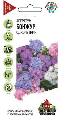 Агератум Бонжур смесь. Очень красивая и длительно цветущая смесь сортов с большими пушистыми шапками соцветий. Растения из семейства Астровые, высотой 20-25 см. Цветет обильное с июня до заморозков. Соцветия мелкие, душистые, до 1-1,5 см, собраны в более крупные щитковидные соцветия до 8-10 см в поперечнике. Окраска разнообразная. Агератум засухоустойчив, светолюбив, но может расти при небольшом затенении, предпочитает легкие, умеренно плодородные почвы. Теплолюбив, заморозков не переносит. Используют на клумбах, в рабатках, миксбордерах, агератумами украшают балконы.