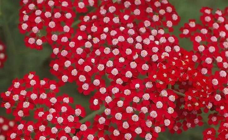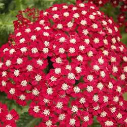 Тысячелистник обыкновенный Laura (Лаура). Цветки тёмно-рубиново-красные с большим белым глазком, в плотных плоских соцветиях, не блёкнут при отцветании. Цветение длительное.