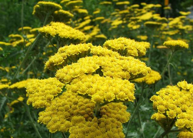 Ахиллея (Тысячелистник) Moonshine (Муншайн). Высота взрослого растения может достигать 60 см. Стебли тонкие, крепкие, серо-зеленого цвета. На стеблях располагаются небольшие, густо-рассеченные, серо-зеленые листья, которые собраны в прикорневые розетки. Цветки очень мелкие (до 0,5 см в диаметре), простые, ярко-желтого цвета, собраны в крупные щитоподобные соцветия (около 10 см).