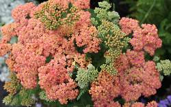 Ахиллея (Тысячелистник) Peachy Seduction (Пич Седакшен). Сорт из серии "Seduction". Цветки персиково-розовые не выгорают, собраны в плотные плоские соцветия диаметром 5-10 см. Листва глубоко-рассечённая, папоротниковидная, с пряным ароматом, сохраняющимся у высушенных растений. Растение очень компактное, высотой 60-70 см. Предпочитает сухую почву.