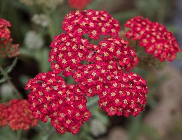 Ахиллея (Тысячелистник) Pretty Woman (Прити Вумен). Цветки кораллово-красные в плоских соцветиях диаметром 8-10 см. Листья папоротниковидные. Стебли прочные, вертикальные, хорошо разветвлённые.