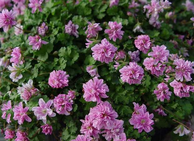 Аистник Flore Pleno (Флоре Плено). Образует небольшие подушковидные розетки. Ажурные листики насыщенного зеленого цвета, махровые цветки розоватые с сиреневыми прожилками. Цветет на протяжении всего летнего сезона. Необычайно красиво смотрится в альпинариях, рокариях, на различного рода отсыпках и отмостках. Заполняет щели между плитами. Отлично себя чувствует на каменных ступенях.