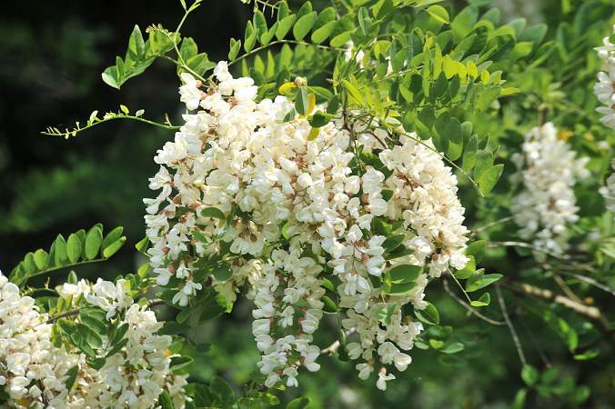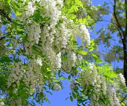 Робиния лжеакация (Акация белая). Робиния ложноакациевая, или Белая акация (народное название) растёт быстро, особенно до 10 лет, ежегодный прирост в высоту 60-80 см, в ширину 20-30 см. Развивает глубокую и мощную корневую систему; даёт поросль от пня и корневые отпрыски. Цветёт уже в шестилетнем возрасте. Очень светолюбива и засухоустойчива.