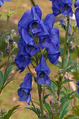 Аконит Arendsii (Арендса). Яркие синие цветки в плотном соцветии. Листья темно-зеленые, блестящие, пальчато-рассеченные. Длительное цветение. Один из лучших сортов. Соцветия аконитов можно использовать для букетов. Срезку производят, когда распустится одна треть цветков.