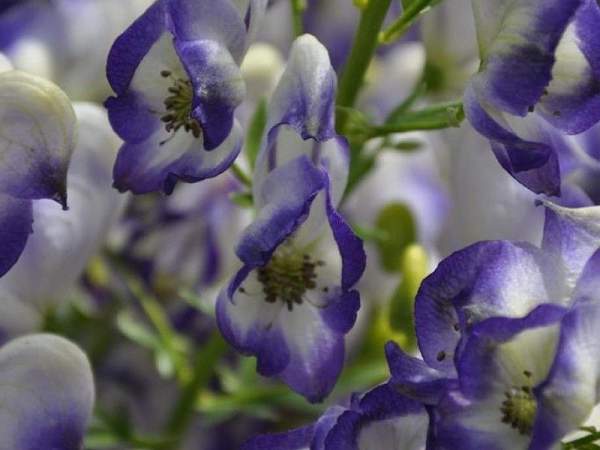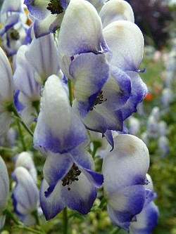 Аконит Кармихеля Cloudy (Клауди). Цветки почти белые с бледно-лавандово-фиолетовым краем. Цветение в августе-октябре. Цветоносы прочные. Листья декоративные, глубоко вырезанные, тёмно-зелёные, глянцевые. Высота 60-80 см и ширина 30-40 см. Место солнечное или полутенистое. Почва влажная. Зона 3 (до -34 °С).