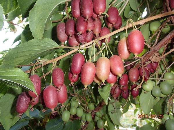 Актинидия Аргута Ken's Red (Кенс Рэд). Женский красноплодный плодоносный сорт со вкусными сладкими плодами. Кожура съедобная. Плоды созревают в сентябре-октябре, размер около 4 см. Начинает плодоношение на 3-4 год. Выдерживает морозы до -25 °C.