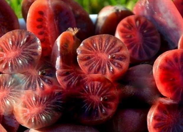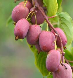 Актинидия Аргута Purpurna Sadowa (Пурпурна Садова). Красноплодный, обильно плодоносящий сорт со вкусными плодами, созревающими в сентябре, со съедобной кожурой. Плоды овальные, около 3,5 см длиной и 2,5 cм шириной. Начинает плодоношение на 3-4 год. Холодостойка.