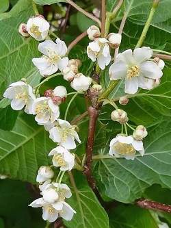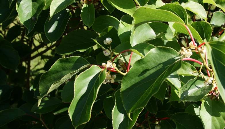 Актинидия аргута Солнечный. Мужское растение, сильнорослое. Универсальный опылитель для сортов актинидии аргута. Листья цельные, зелёные, крупные, длиной более 10 см, без пестролистности. Зимостойкий. Цветет белоснежными соцветиями — на фоне яркого листового покрова и коричнево-красных побегов смотрится очень эффектно. Растение отличается выносливостью к зимним холодам, сезонным перепадам температуры и вредителям.