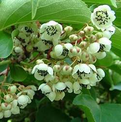 Актинидия аргута Вейки (мужской сорт). Опылитель зацветает в июне белыми небольшими цветками, собранными в рыхлые полузонтики. Достаточно посадить 1 мужское растение на 6-8 женских.