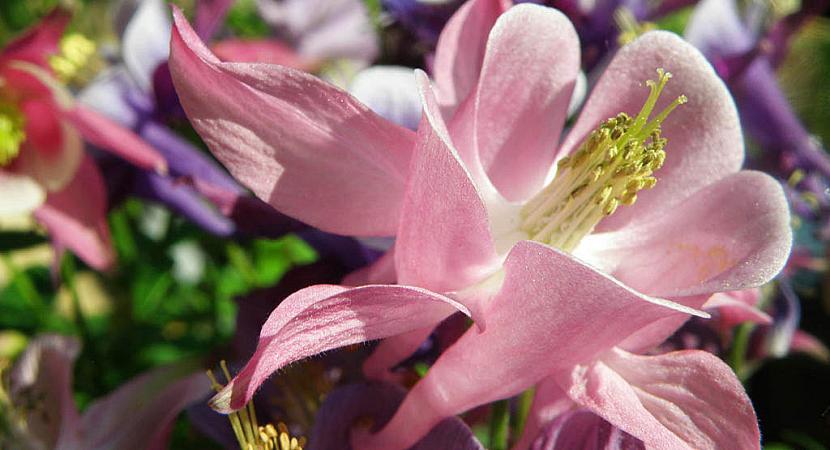 Аквилегия Biedermeier (Бидермейер). Неприхотливое растение семейства Лютиковые высотой до 35 см. Ценится за оригинальные поникающие цветки разнообразной окраски и ажурные листья. Цветёт с конца мая до середины июля. Желательно высаживать в полутени, но может расти и на солнечных участках.