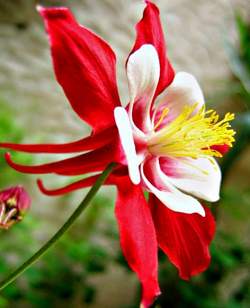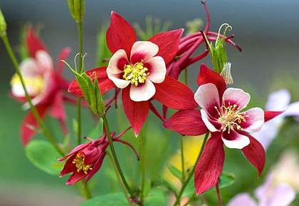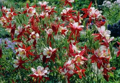 Аквилегия Crimson Star (Кримсон Стар). Неприхотливое многолетнее растение семейства Лютиковые высотой 50 см. Образует полураскидистые кусты до 40-50 см в поперечнике. Ее дважды-тройчатые листья декоративны до осени. Цветки выразительные, бело-красные, с яркими красными шпорцами, до 8 см в диаметре, на длинных цветоносах. Растения морозоустойчивые, предпочитают умеренно влажные места, рыхлые перегнойные почвы, переносят полутень.
