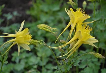 Аквилегия золотистоцветковая. Имеет крупные, смотрящие в стороны цветки с длинными шпорцами. Цветки изящные, многочисленные, 4-4,5 см в диаметре, чашелистики бледно-желтые, лепестки темно-желтые, шпорцы тонкие, 3-4 см длиной. Цветет в июне — июле. Цветение очень обильное. Стебли прямые, до 100 см высотой. Листья светло-зеленые, с мелкими долями.