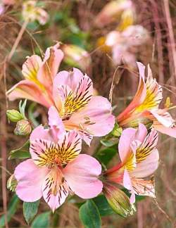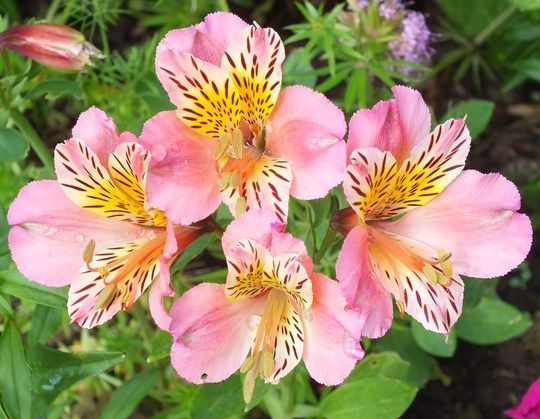 Альстромерия Flirt (Флирт). Цветет обильно и продолжительно. Очень красивое компактное растение для среднего плана миксбордеров. Высота около 50 см. Цветки розовые, на трех внутренних лепестках желтое пятно с тигровой штриховкой. Цветки собраны в соцветия и имеют диаметр около 5 см. В зимний период растению необходимо укрытие.