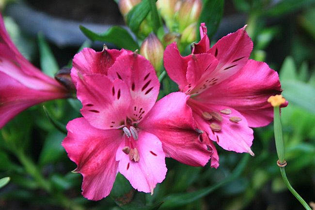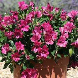 Альстромерия Inticancha Machu (Интиканча Мачу). Невысокий (30 см) компактный сорт. Побеги прямые, гибкие. Листья собраны в верхней части побега, линейные, изогнутые. Цветки крупные, до 7,5 см, красновато-фиолетовые. Собраны в соцветия, размер соцветия до 15 см.