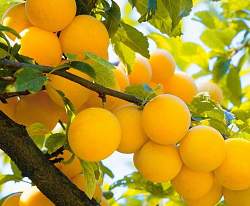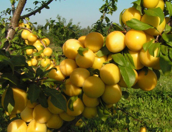 Слива русская (Алыча) Гек. Среднепозднего срока созревания. Урожайность высокая. Самобесплодный. Универсальный. Дерево среднерослое. Крона плоскоокруглая, средней густоты.