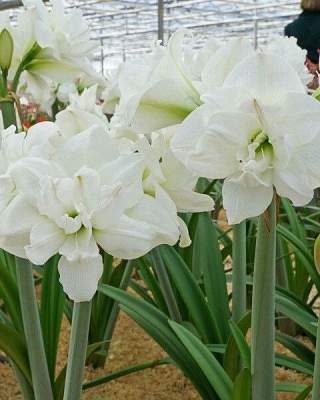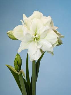 Амариллис Akiko (Акико). Высота растения 50-70 см. Цветок махровый, очень крупный, белоснежный с блестящим напылением, в центре зеленый глазок.