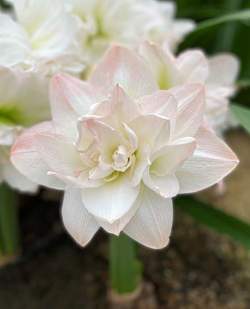 Амариллис Arctic Nymph (Арктик Нимф). Высота растения 50-70 см. Цветок крупный, махровый, белый с розовым отливом. Эффект перламутра. Предпочитает яркий рассеянный свет.