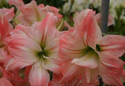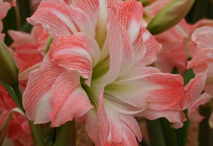 Амариллис Giant Amadeus (Джайант Амадей). Высота растения 50-70 см. Цветок крупный, махровый с белым центром, края лепестков покрыты ярко-розовыми частыми штрихами.