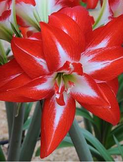 Амариллис Splash (Сплэш) — высота цветоноса до 50 см. Цветок махровый, лепестки заостренные, ярко-красные с белой стрелой по центру. Цветение обильное. Один из самых эффектных сортов.
