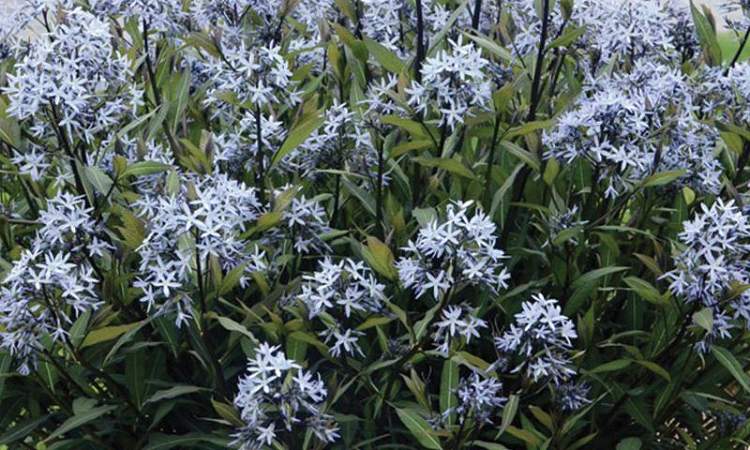 Амсония Storm Cloud (Сторм Клауд). Цветки звездчатые, бледно-сиренево-лавандовые, нежные, собраны в крупные соцветия. Очень темные фиолетовые стебли, особенно весной. Цветет в июне. Высота 70-90 см. Растет вертикально. Листья ланцетные, осенью окрашиваются в золотистые тона.