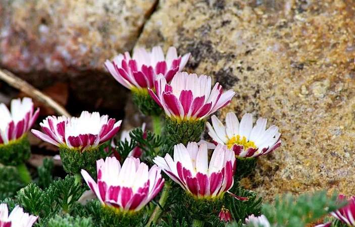 Анациклус лекарственный Silberkissen (Зильберкиссен). Растение для альпинария, образует коврик распростертых стеблей с серо-зелеными листьями. Цветы похожи на ромашку. Бутоны красные, цветы — белые.