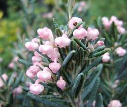 Андромеда Blue Lagoon (Блу Лагун). Вечнозеленый кустарничек с приподнимающимися ветвями высотой 30-40 см с кожистыми листьями длиной 9-26 мм. Цветки поникающие, на длинных цветоножках, собраны в двух-шестицветковую кисть на концах прошлогодних побегов. Цветет в мае — июне.