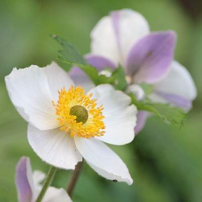 Анемона Elfin Swan (Elfin Swan). Цветки маленькие, чашевидные белые, с наружной стороны фиолетовые. Высота листьев 30 см, высота цветоносов 40 см.