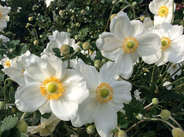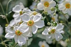 Анемона Honorine Jobert (Онорин Джобэт). Высота растения 30-40 см. Цветки диаметром 5-7 см, чисто-белые, из 6-9 перекрывающихся лепестков. Листья тёмно-зелёные. Стебли изящно разветвлённые. Высота 90 см.