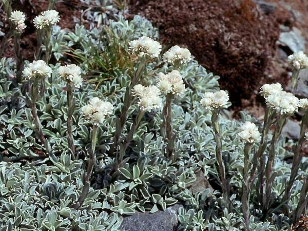 Антеннария Alba (Альба). Почвопокровное растение с серебристыми войлочными листьями. Высота до 20 см. Цветет в конце весны пушистыми цветками, собранными в корзинки. Полностью зимостойка в средней полосе.