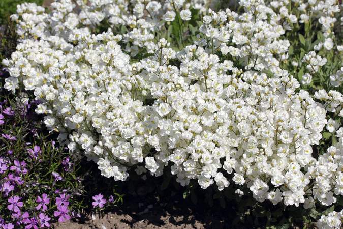 Арабис кавказский Plena (Плена). Растение семейства крестоцветных образует плоскую дернистую подушку. Цветки собраны в большие кисти, полностью покрывающие всю дернинку в мае-июне. Цветки белоснежные, махровые. Высота куста 20 см. Почва обычная садовая, но дренированная, без застоя воды. Место обязательно солнечное.