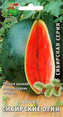 Арбуз Сибирские огни. Период от всходов до технической спелости 75-85 дней. Растение среднеплетистое - до 2,5 м. Плоды шаровидной формы, массой до 5 кг. Окраска кожицы темно-зеленая, с тонкими полосами. Кора тонкая. Мякоть ярко-красная, сочная.