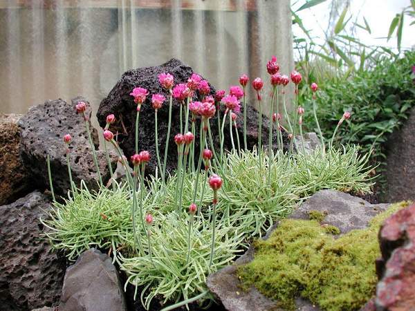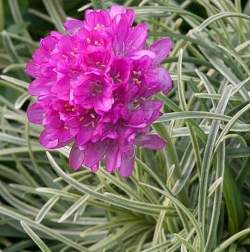 Армерия приморская Nifty Thrifty (Нифти Трифти). Цветки ярко-розовые. Листья зеленые с яркой белой окантовкой. Компактный медленнорастущий сорт. Цветение в мае-июне. Растение высотой 15–20 см.