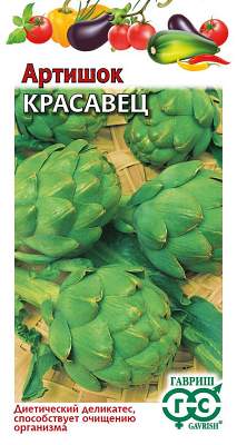 Артишок Красавец 0,5 г. Период от полных всходов до технической спелости 160-165 дней. Растение высотой 90-110 см, слабоветвистое. Лист крупный, перисторассеченный с зубчатым краем, серовато-зеленый, снизу сильноопушенный и более светлый, с мелкими колючками по краям. Соцветие крупное, зеленой окраски с плотно прижатыми чешуями. В первый год на каждом растении образуется 4-6 соцветий, на второй - 10-12 соцветий. Масса одного соцветия 70-120 г.