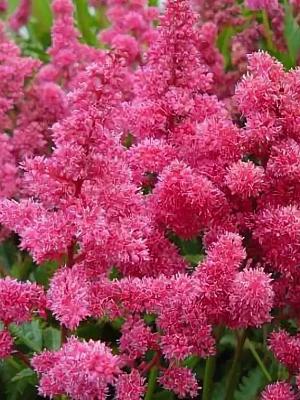 Астильба японская Bonn (Бонн). Цветки ярко-розовые, собраны в очень пушистые пирамидальные соцветия средней плотности. Высота 40 см, в цвету — 60 см.