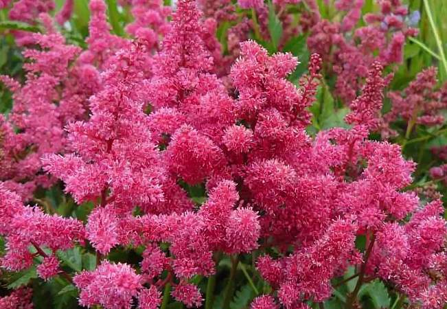 Сроки цветения различных сортов астильбы — с конца июня до сентября, можно подобрать такую коллекцию, чтобы любоваться цветением почти все лето. Оптимальная освещенность — разреженная тень или затенение в самое жаркое время дня, многие астильбы прекрасно чувствуют себя и на открытом солнце.