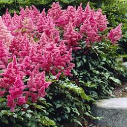 Астильба японская Bonn (Бонн). Цветки ярко-розовые, собраны в очень пушистые пирамидальные соцветия средней плотности. Высота 40 см, в цвету — 60 см.