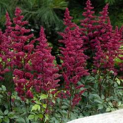 Астильба Burgundy Red (Бургунди Ред). Красивый и необычный цвет — темный винный. Компактная прямостоячая форма с характерными метельчатыми соцветиями на красноватых стеблях!