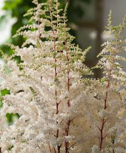 Астильба Cappuccino (Капучино). Крупная белоснежная астильба, цветоносы красновато-коричневые, красиво контрастируют с соцветиями. Соцветие пирамидальное, пушистое, ажурное, очень красивое. Листва кружевная, молодая ярко-бордовая, затем зеленая с коричневатым оттенком.
