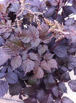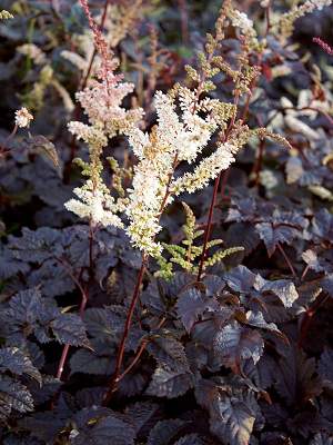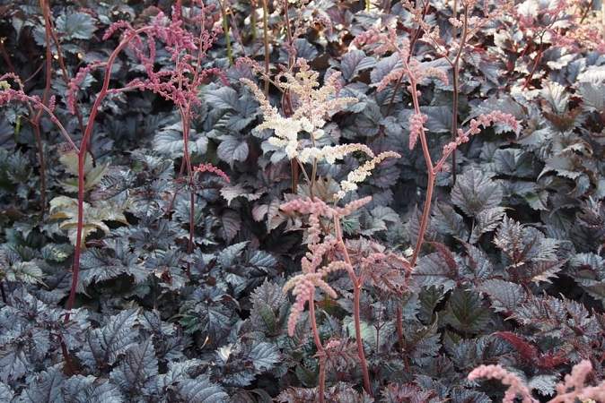 Астильба Chocolate Shogun (Шоколад Сёгун). Листья глянцевые, насыщенные, шоколадно-фиолетовые. Не меняют цвет в течение всего сезона. Цветки кремово-розовый.