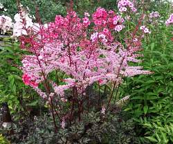 Астильба Delft Lace (Дэлтфт Лейс). Оригинальный и очень красивый сорт "Дельфт Лейс" ("Дельфтское Кружево"). Соцветия очень крупные, ажурные, стоят высоко над листьями. Темно-бруснично-розовые бутоны постепенно распускаются в абрикосово-розовые плотные соцветия. Черешки темно-бордовые.