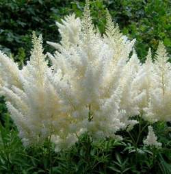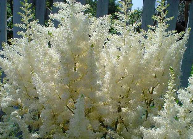 Астильба Diamant (Диамант). Листья крупные, светло-зеленые, без блеска, края листочков бурые. Цветки белые, в широко-метельчатом соцветии средней плотности до 35 см длиной и 14-20 см в поперечнике. Зацветает в первых числах июля.