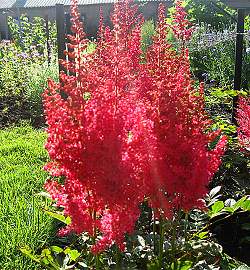 Астильба Else Schluck (Эльза Шлук). Соцветия крупные, пушистые, пирамидальные. Цвет восхитительный — ярко-карминно-красный. Куст довольно высокий: в период цветения до 100 см. Отлично смотрится в сочетании белыми и пурпурными сортами.