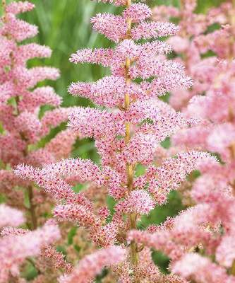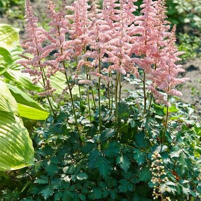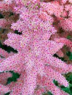Астильба Glitter and Glamour (Глиттер энд Гламур). Астильба имеет высоту до 80 см. Великолепное, многолетнее растение с большими розовыми перьями соцветий. Если вы внимательно посмотрите, вы увидите, что маленькие цветки темные в центре. Это растение имеет красивые, темно-зеленые листья и легко выращивается.
