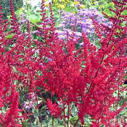 Астильба Glut (Глут). Форма соцветия метельчатая, ажурная, со слегка поникающими кончиками. Цвет ярко-красный. Прекрасно растёт в тени и полутени.