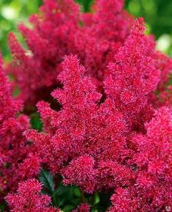 Астильба Koblenz (Кобленц). Листья дваждыперистые, темно-зеленые, глянцевые, на красноватых черешках, что делает куст нарядным до и после цветения. Цветки с приятным ароматом, собраны в плотные, ромбические соцветия. Высота растения 50 см, цветки карминно-красные.
