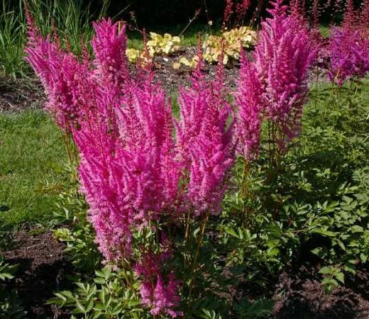 Астильба Mea (Меа). Роскошный сорт. Компактный, с очень длинными пушистыми соцветиями на крепких цветоносах. Цветки ярко-пурпурно-розовые. Цветет очень долго в июле-августе. Высота 60-70 см. Прекрасно цветет как на солнце, так и в полутени.