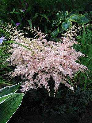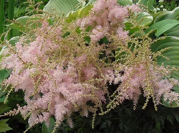 Астильба Pink Lightning (Пинк Лайтнинг). Соцветия ажурные, красиво поникающие, нежно-розовые с перламутровым оттенком, бутоны темнее. Очень красивая, темная жатая блестящая листва с бронзовым оттенком по краям. Куст аккуратный, изящный. Обильное цветение.