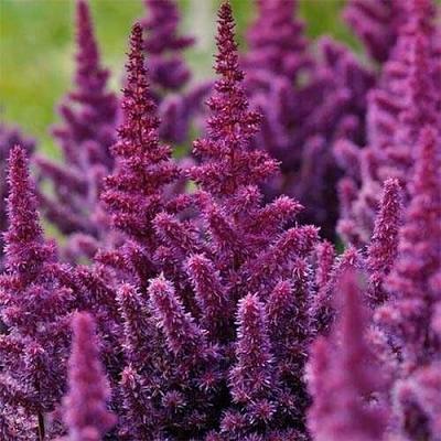 Астильба Purple Rain (Пёпл Рейн). Соцветие насыщенно-пурпурно-фиолетовое, ромбовидное, очень плотное и пушистое, цветоносы пурпурные. Обильное цветение. Куст компактный, хорошо разрастается. Лучше всего чувствуют себя у водоемов или во влажных полутенистых местах.
